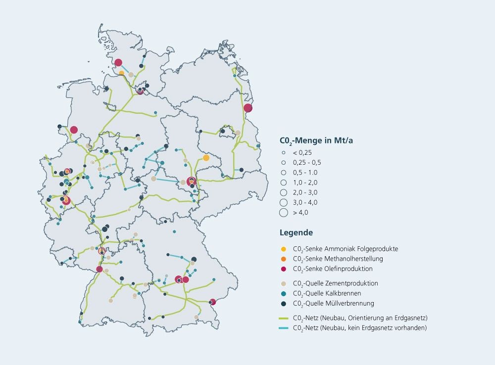 Auf Basis umfassender Transformationsszenarien können zukünftige CO₂-Quellen und -Senken lokalisiert werden. Daraus leitet sich die optimale Trassenführung ab. Ergänzt durch Speicherstandorte und grenzüberschreitende Übergabepunkte entsteht ein konsistentes Bild eines möglichen CO₂-Transportnetzes. Die Systemplanung ist abhängig von Anzahl der Einspeiser, verschiedener Ausbaustufen, Transportmengen und weiteren Systemparametern (Emissionsvermeidung, etwa durch Recycling als Alternative zur Müllverbrennung). Die relevanten CO₂-Mengen aus schwer vermeidbaren Quellen (inkl. Transit) liegen bei etwa 60 Mio. Tonnen jährlich. Daraus ergibt sich ein geschätzter Infrastrukturbedarf von rund 7.000 km Pipeline-Länge.